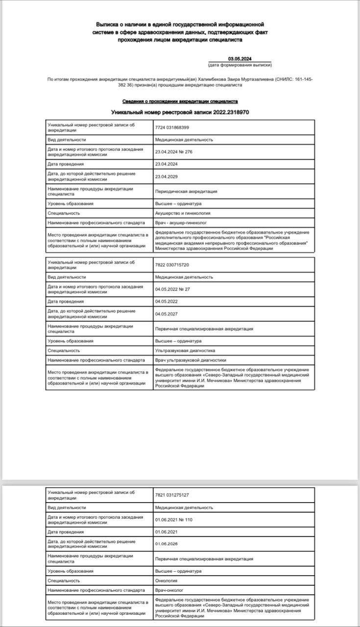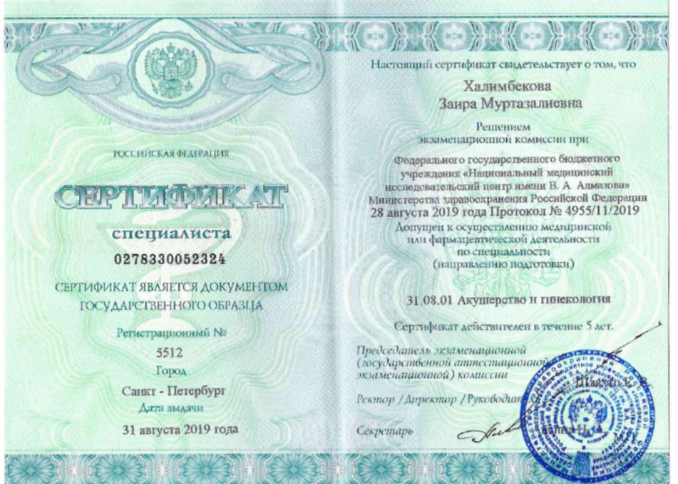 Квалифицированный врач, обладающий большим опытом, предоставляет услуги по диагностике и лечению различных гинекологических заболеваний, включая воспалительные процессы органов малого таза, патологию шейки матки, нарушения менструального цикла, а также эндокринные расстройства и гиперпластические изменения эндометрия. Доктор также проводит консультации по хирургическому лечению патологии шейки матки, дегенеративных заболеваний половых органов, используем малоинвазивные методики оперативных вмешательств в гинекологии. Проводит весь спектр операций и процедур по интимному омоложению. Халимбекова Заира Муртазалиевна является специалистом по оперативной гинекологии и проводит операции по вопросам бесплодия, доброкачественных опухолей матки и яичников, эндометриоза и опущения половых органов. Осуществляет операции как с использованием открытого доступа, так и с использованием лапароскопической хирургии, обладает опытом выполнения малоинвазивных операций. Врач предоставляет неотложную помощь в гинекологии.