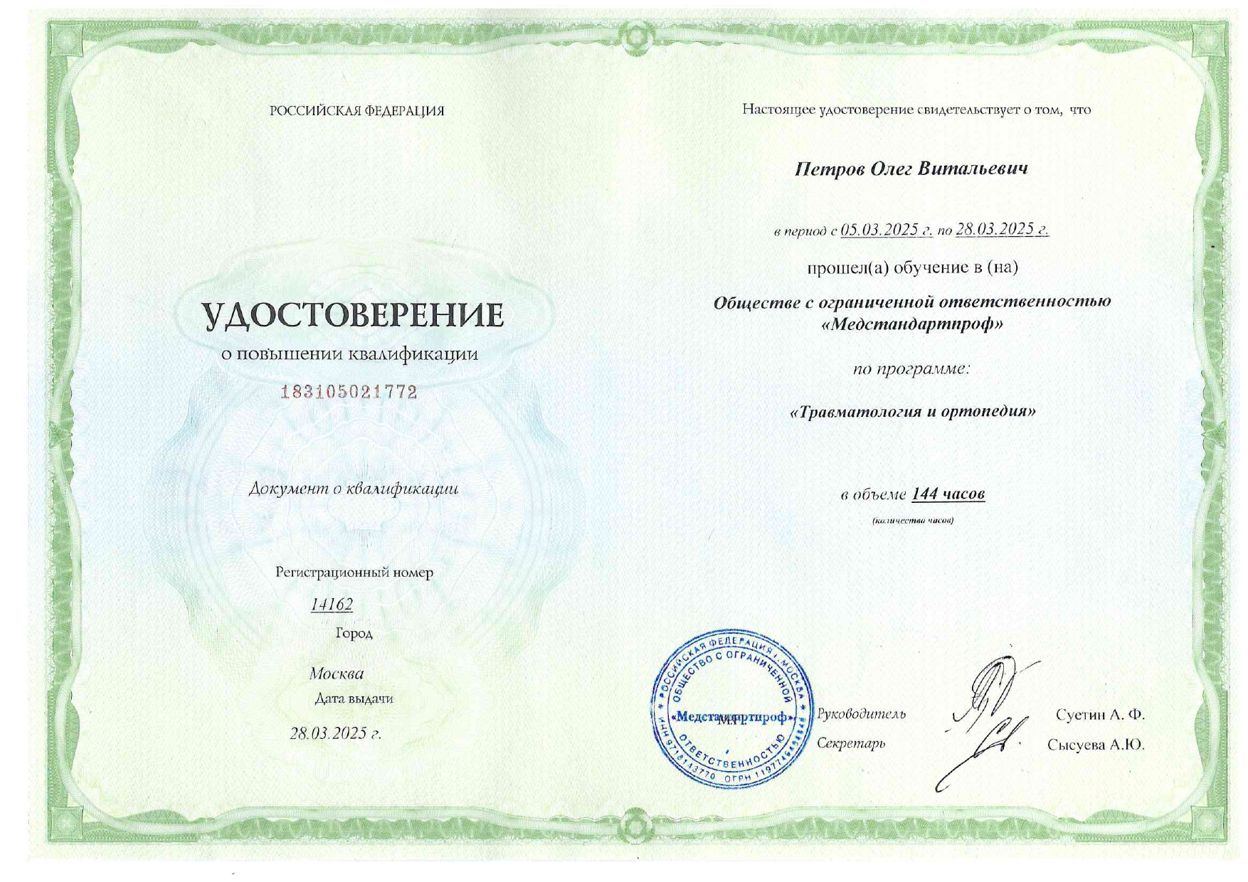 Практикующий специалист с обширным клиническим опытом работы в ведущих травматологических отделениях города. Выполняет экстренные и плановые оперативные вмешательства в условиях стационара и травмпункта. Ведет амбулаторный прием травматологических и ортопедических пациентов взрослого отделения, в том числе на английском языке.