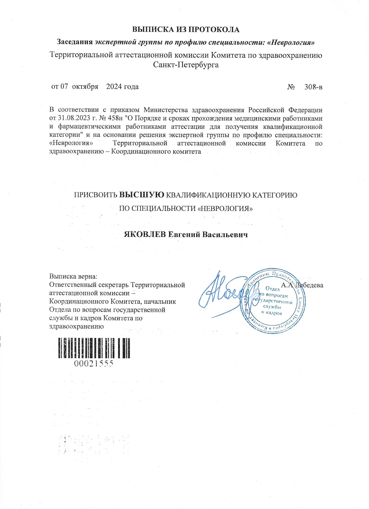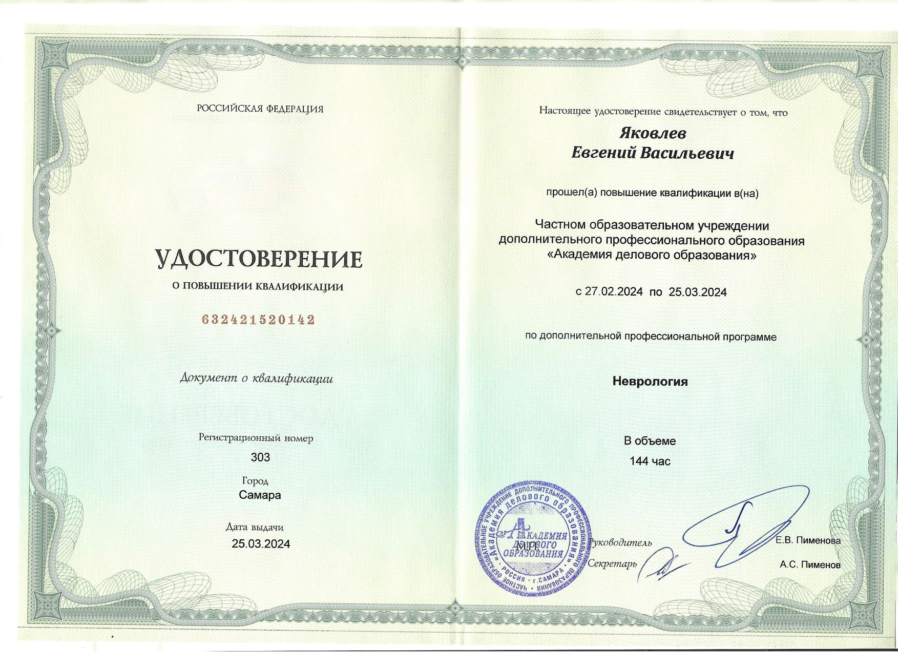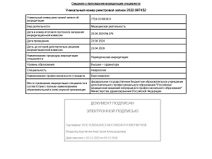 Удостоверение от 16,12.2019 г., «Неврология», срок действия - 16.12.2024 г.;