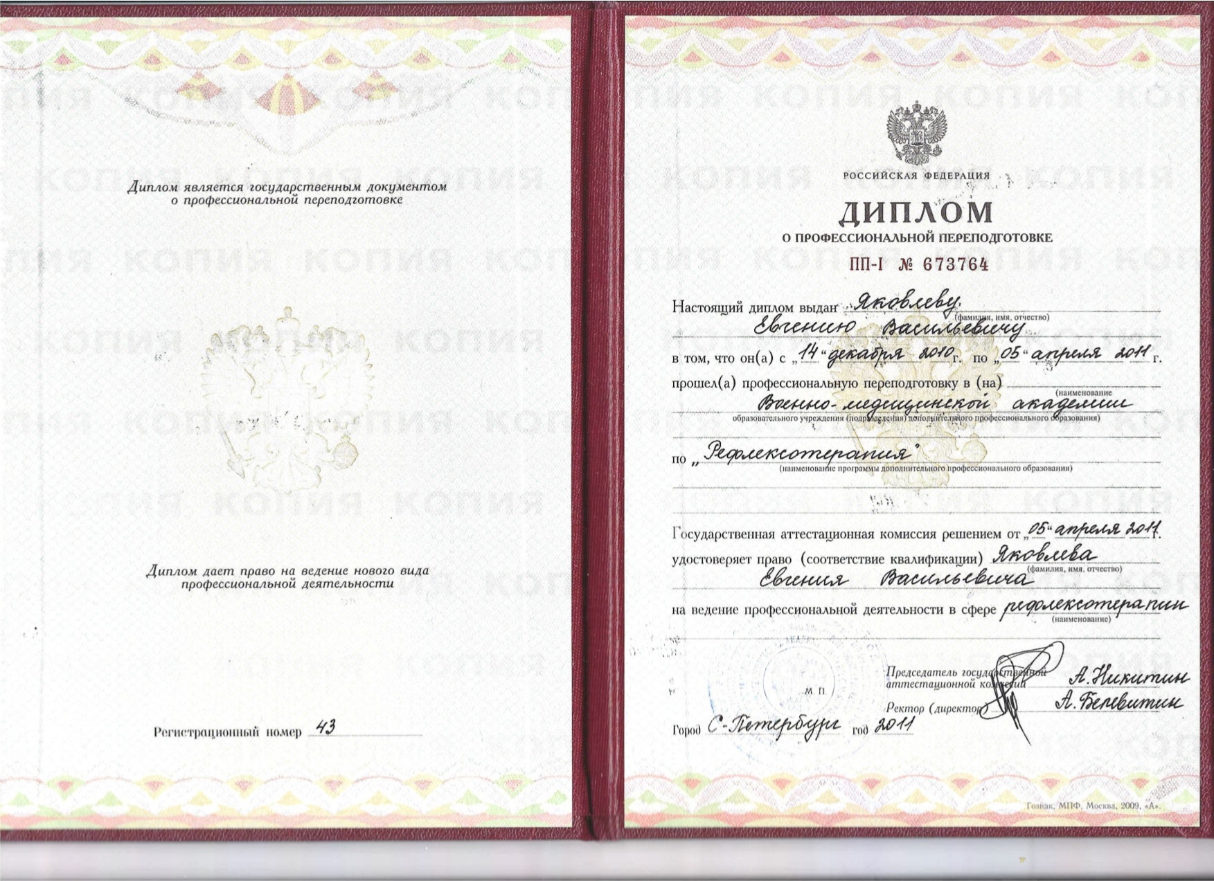 Удостоверение от 06.04.2020 г. «Рефлексотерапия», срок действия - 06.04.2025 г.