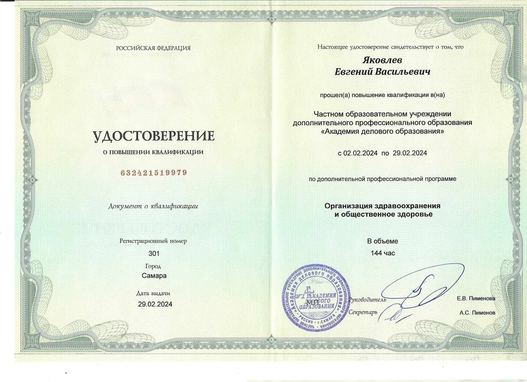 «Организация здравоохранения и общественное здоровье», срок действия - 2029 г.;